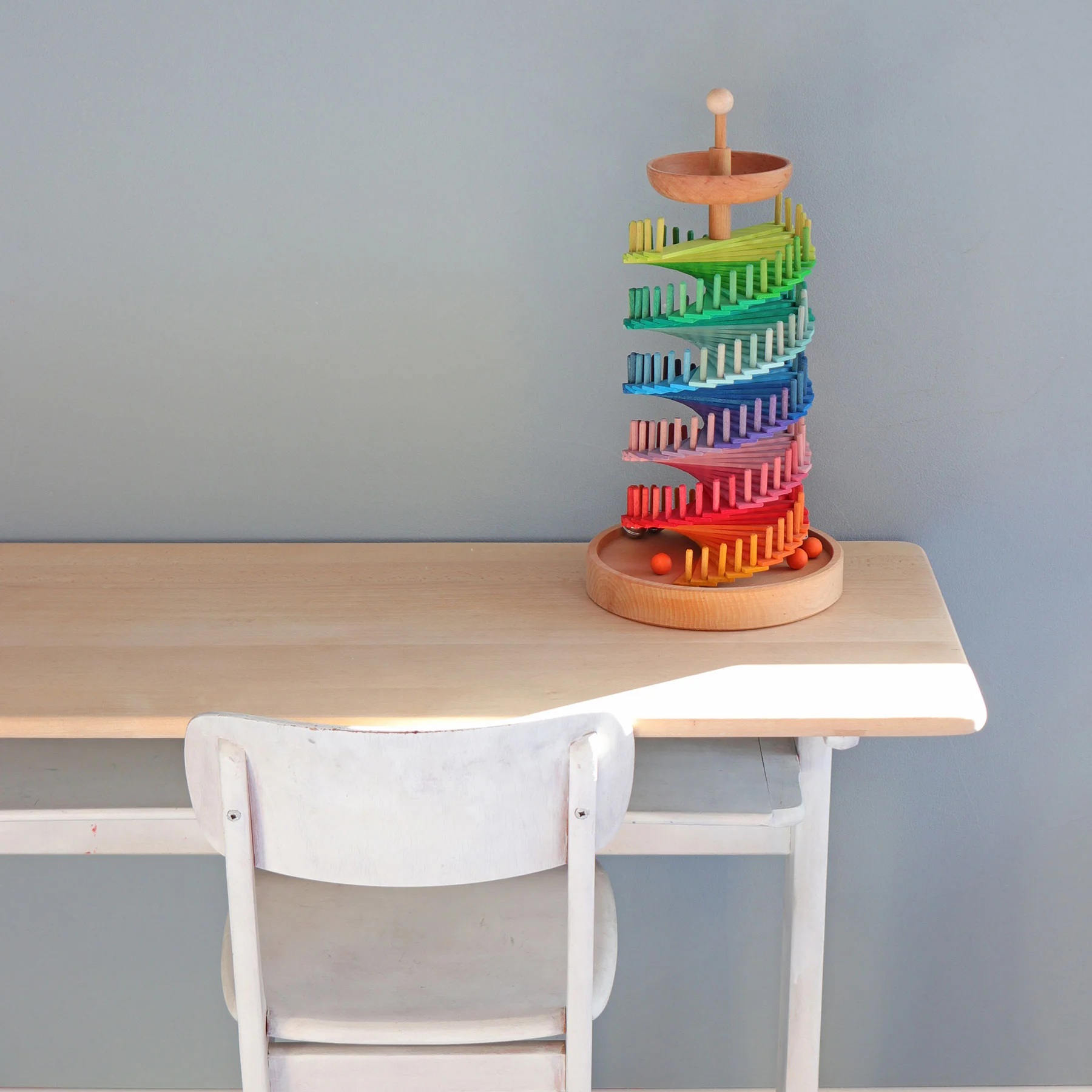 Mit dem Bausatz Kugelbahn kann man eine individuelle, doppelläufige Spiralbahn für Murmeln bauen. Die Kugelbahn darf selbst aufgebaut und nach Belieben farbig sortiert werden. Mit der sich ergebenden zweiläufigen Spiralbahn können auch Murmelrennen gespielt werden: Es kann beispielsweise eine Holzkugel gegen eine der mitgelieferten Kugelglöckchen antreten. Welche hier wohl gewinnt?