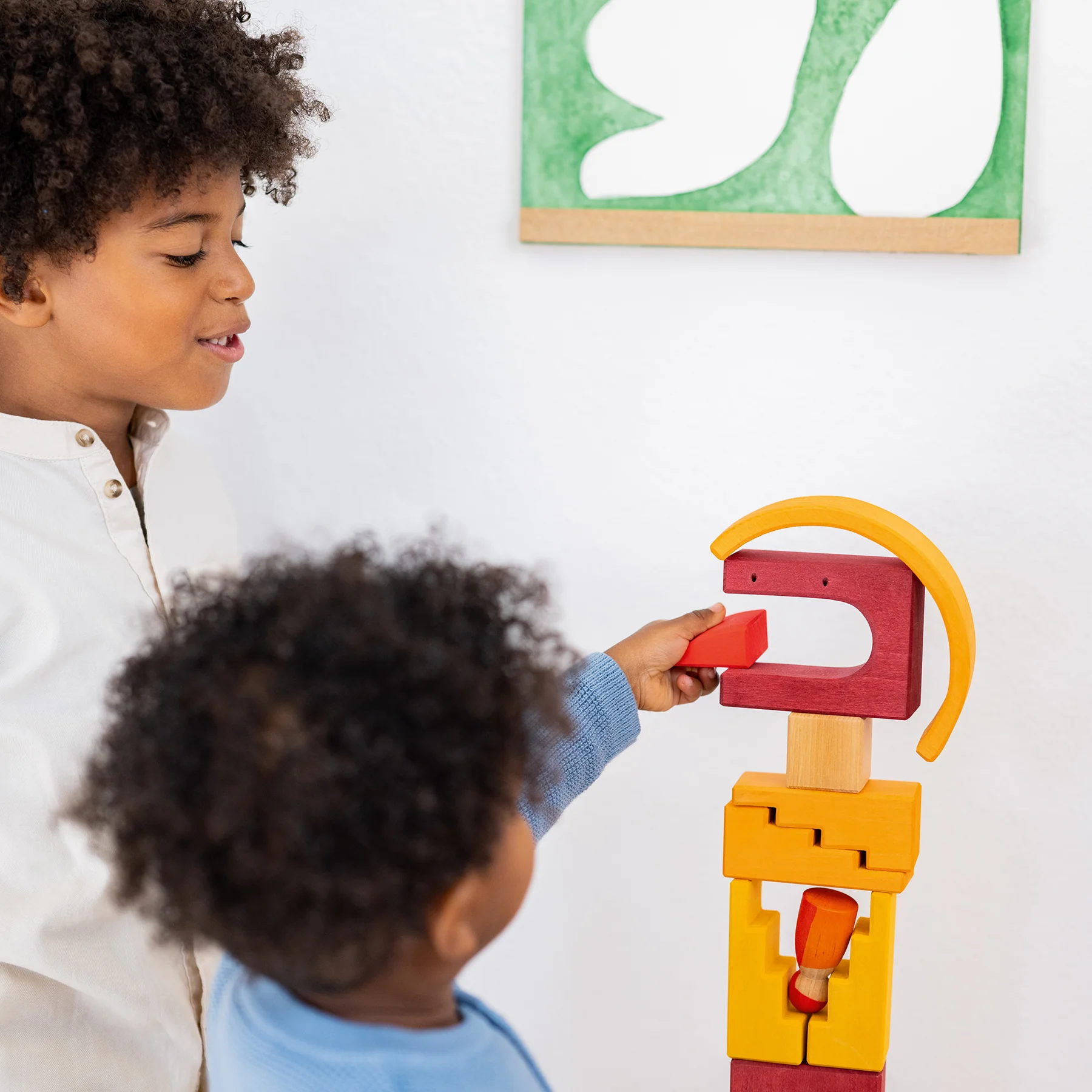 Satte Gelb-, Orange- und Rottöne gemischt mit natürlichem Holz geben der Bauwelt Wüstensand eine tiefe Wärme. Die Baumaterialien in verschiedensten Formen ermöglichen fantasievolles freies Bauen und ergänzen das GRIMM’S Sortiment mit ihren liebevollen Details, wie besonderen Gewändern der beiden Freunde und einer montierbaren, beweglichen Türe.